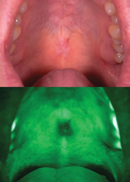 By incorporating this screening test into your traditional head and neck oral exam, you will have the ability to visually identify oral cancer early, as well as other oral and oropharyngeal cancers. This adjunctive device is powered with blue light LEDs and visually allows for oral examinations that identify pre cancer risk factors.