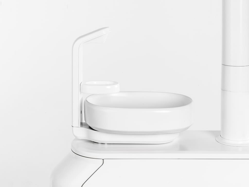 For the patients comfort and an efficient treatment, Model Pro unit includes movable bowl with optimal rotation within 120 degrees to the patient and out. The bowl rotation, cup filling and bowl rinsing can be easily controlled through tablet interface. In addition, the cup holder can include 2 sensors, which indicate cup presence and water level. The water bottle system in size of 1,3L is integral part of each unit as standard. Central water supply switch can be installed upon request as well. Removable bowl with smooth surface is easy to clean and disinfect.
